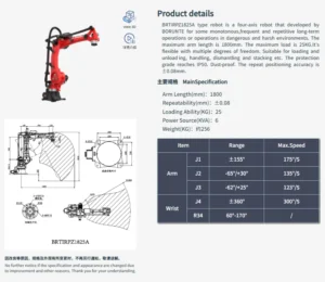 Yüksek doğruluk ve hızlı reaksiyona sahip esnek dört eksenli endüstriyel istifleme robotu, gücünü tam bir servo motordan alır. Maksimum kol açıklığı 1800 mm ve maksimum yük 25 kilogramdır. Hareket kesin ve esnektir; çeşitli hareketleri gerçekleştirmek için az miktarda yapı kullanılır.